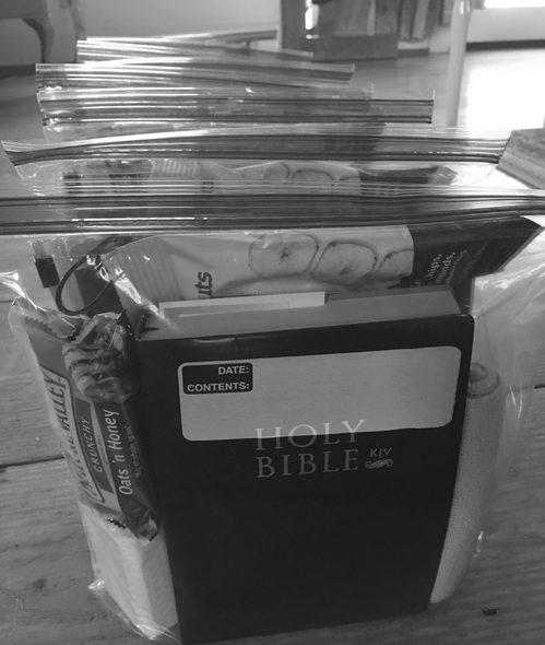 Our members help fill and distribute care bags to pass out to homeless members of our community. Bags contain a Bible, care items, water, and snacks.